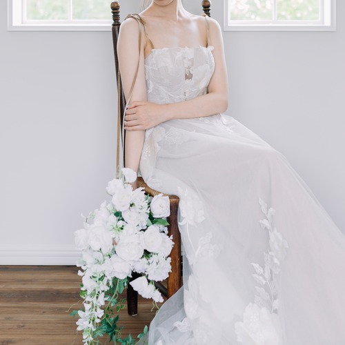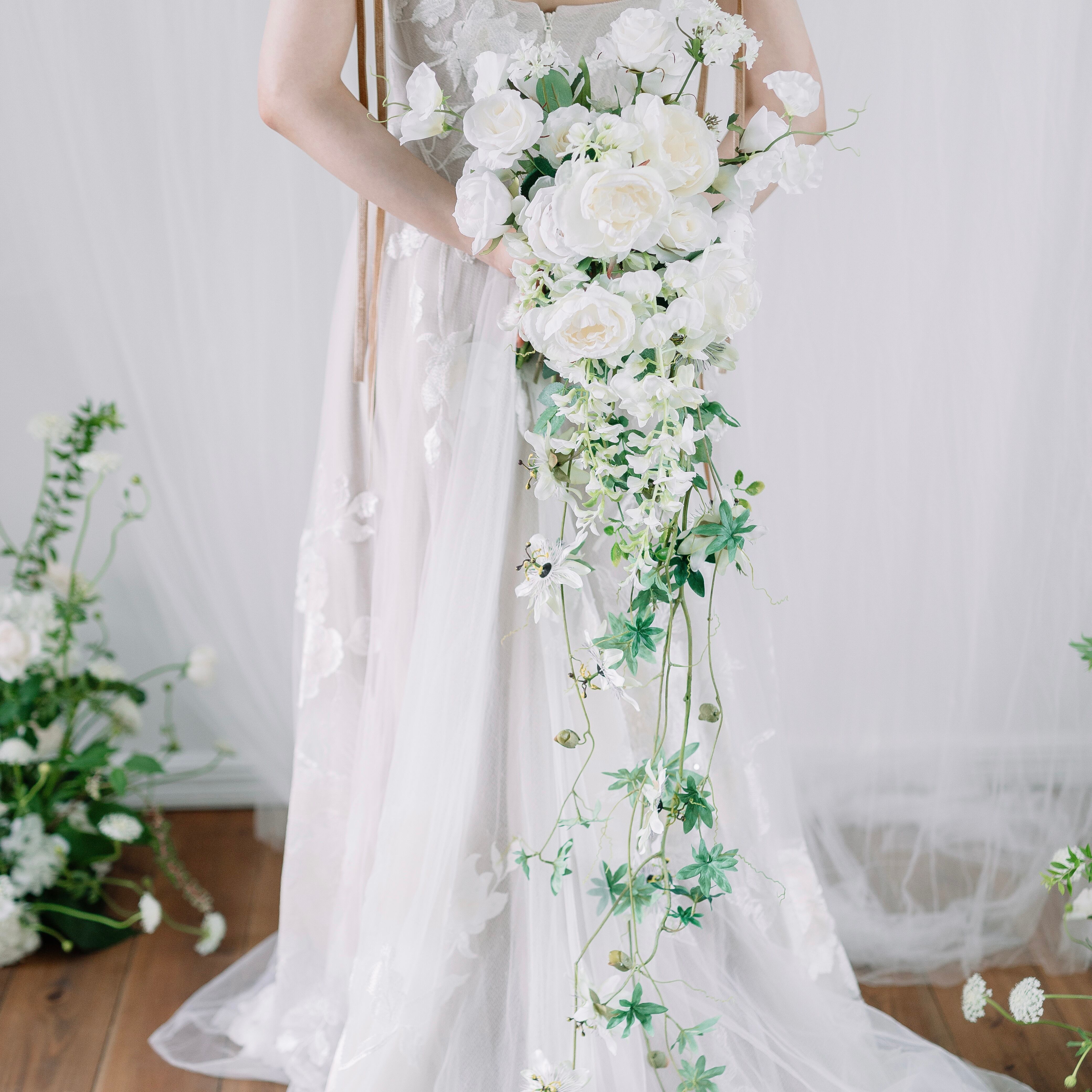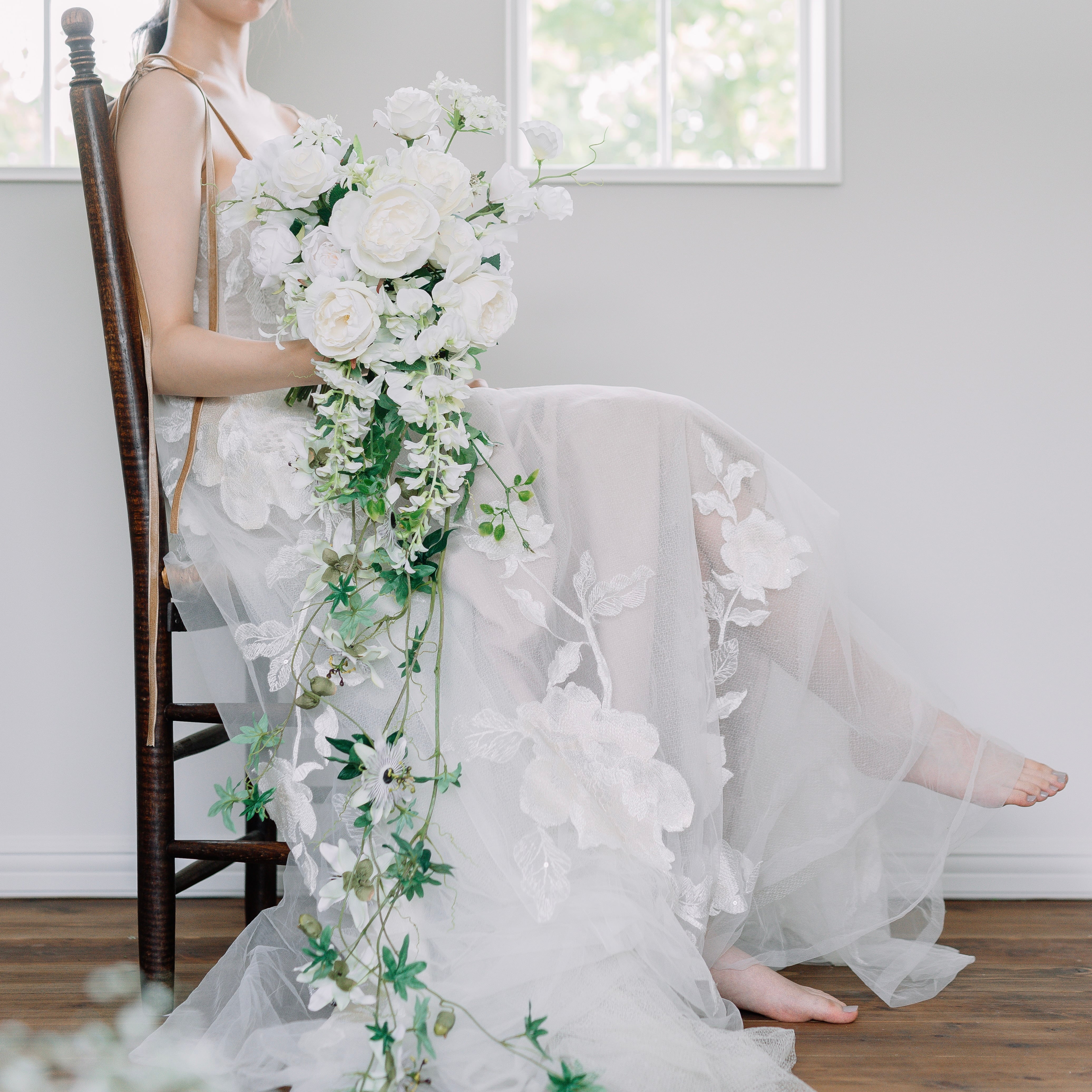 自然に流れる花材を活かし、繊細で華やかなデザインが施されたこのブーケは、